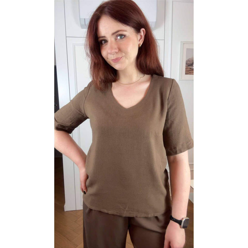 Ta koszula w odcieniu głębokiego, ciemnego brązu została uszyta z tkaniny o składzie 97% wiskoza, 3% elastan. Materiał o twillowym splocie pięknie się układa, jest gładki, delikatnie elastyczny i ma subtelny, elegancki połysk. To model, który sprawdzi się zarówno w pracy, jak i w bardziej swobodnych stylizacjach — zawsze wtedy, kiedy chcesz wyglądać lekko, kobieco i bardzo stylowo.
