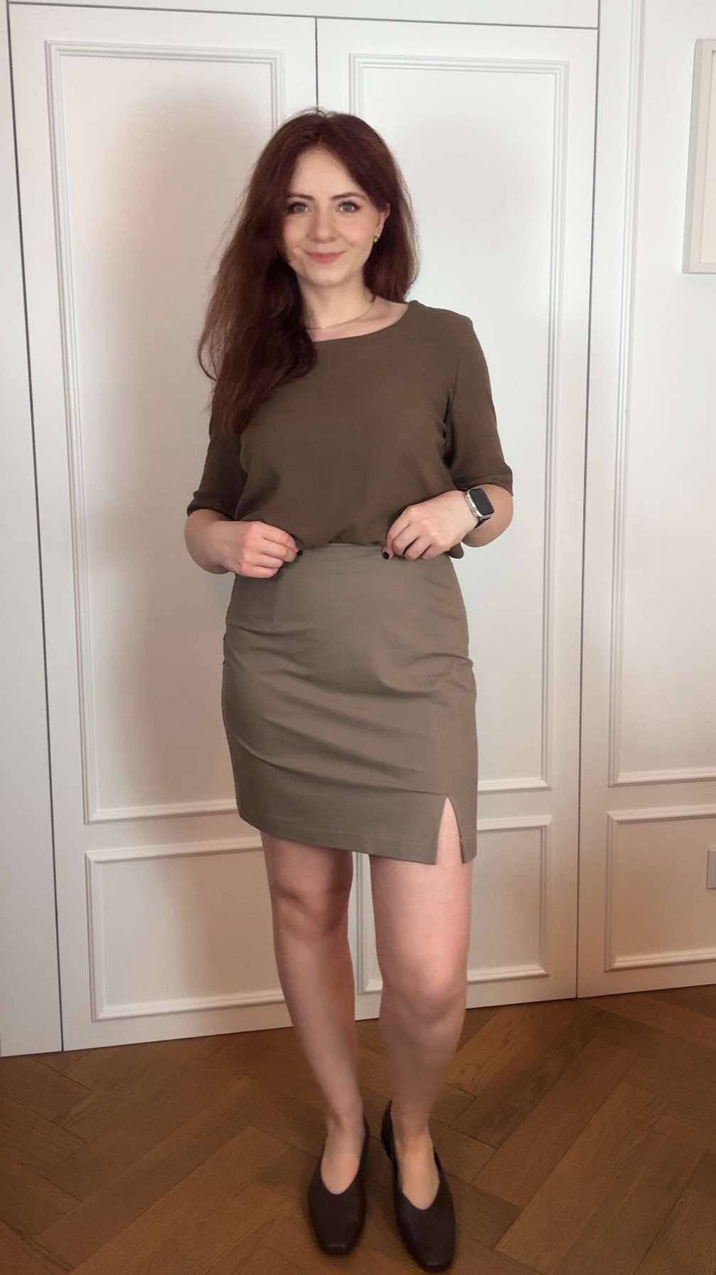Rękawy proste podwijane.