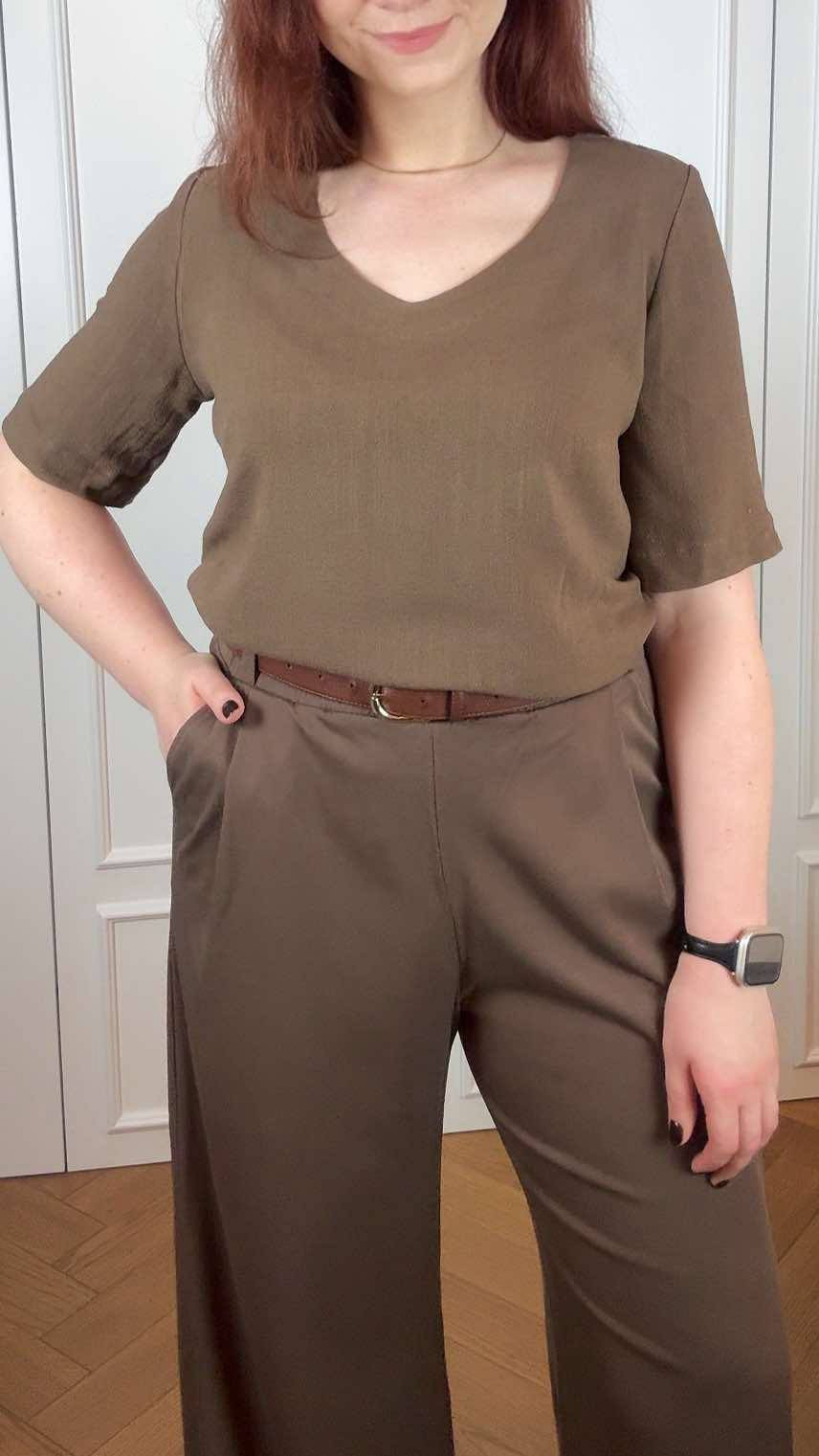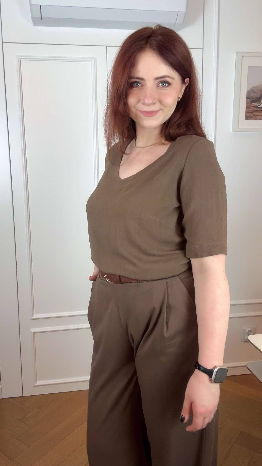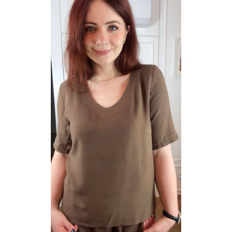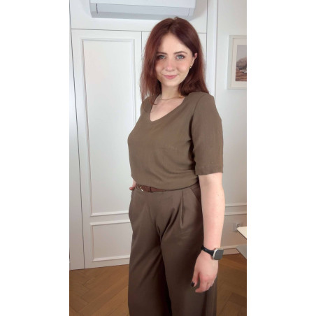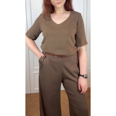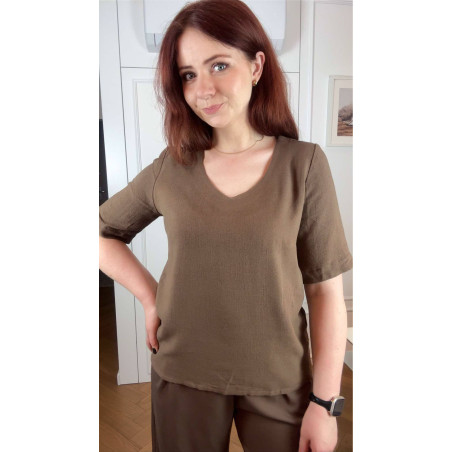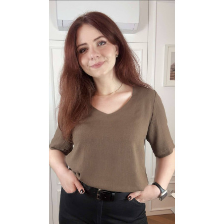 Bernatka - Bluzka lniano-wiskozowa z dekoltem V - orzech laskowy