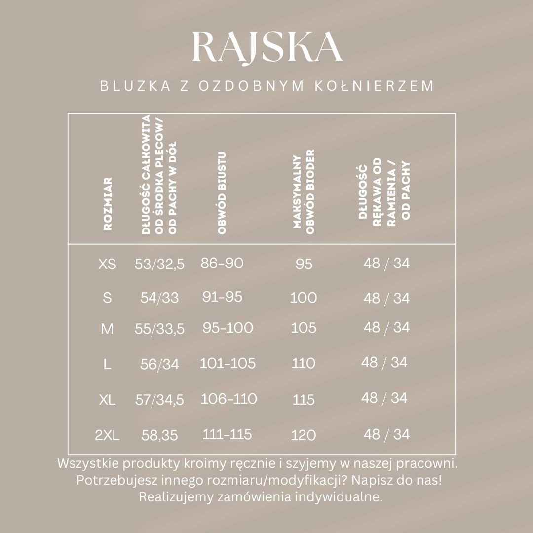 Każda bluzka Rajska powstaje w naszej pracowni w Krakowie – szyjemy ją po zamówieniu, bez nadprodukcji. Produkt w standardowym rozmiarze podlega zwrotowi i wymianie. Istnieje możliwość modyfikacji konstrukcji: możemy dopasować długość, szerokość, zmienić układ detali lub uszyć rozmiar spoza naszej rozmiarówki. Oferujemy również szycie na miarę na podstawie Twoich wymiarów.
