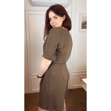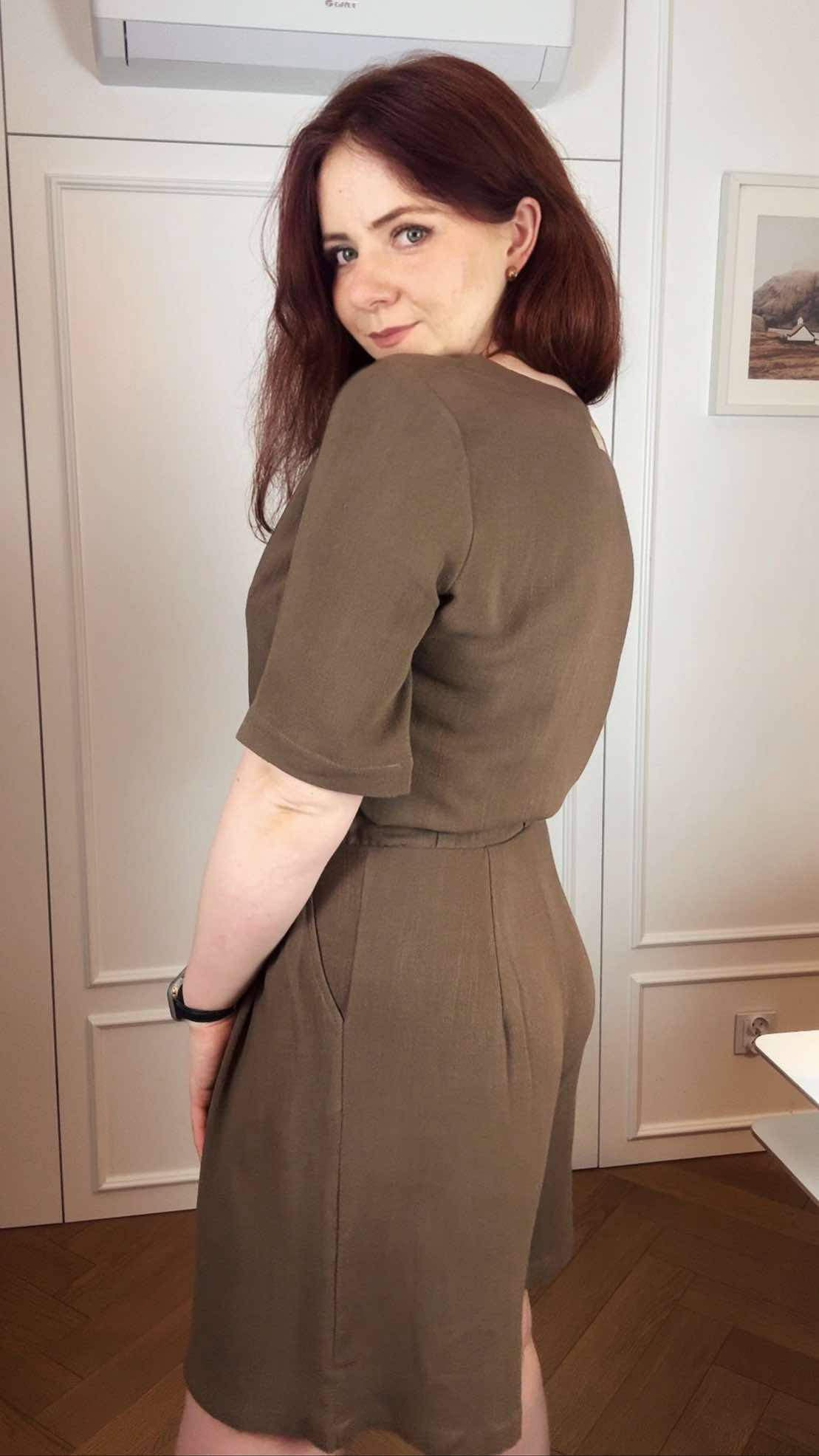 Zakładki z przodu, zaszewki z tyłu. Dwie boczne kieszenie.