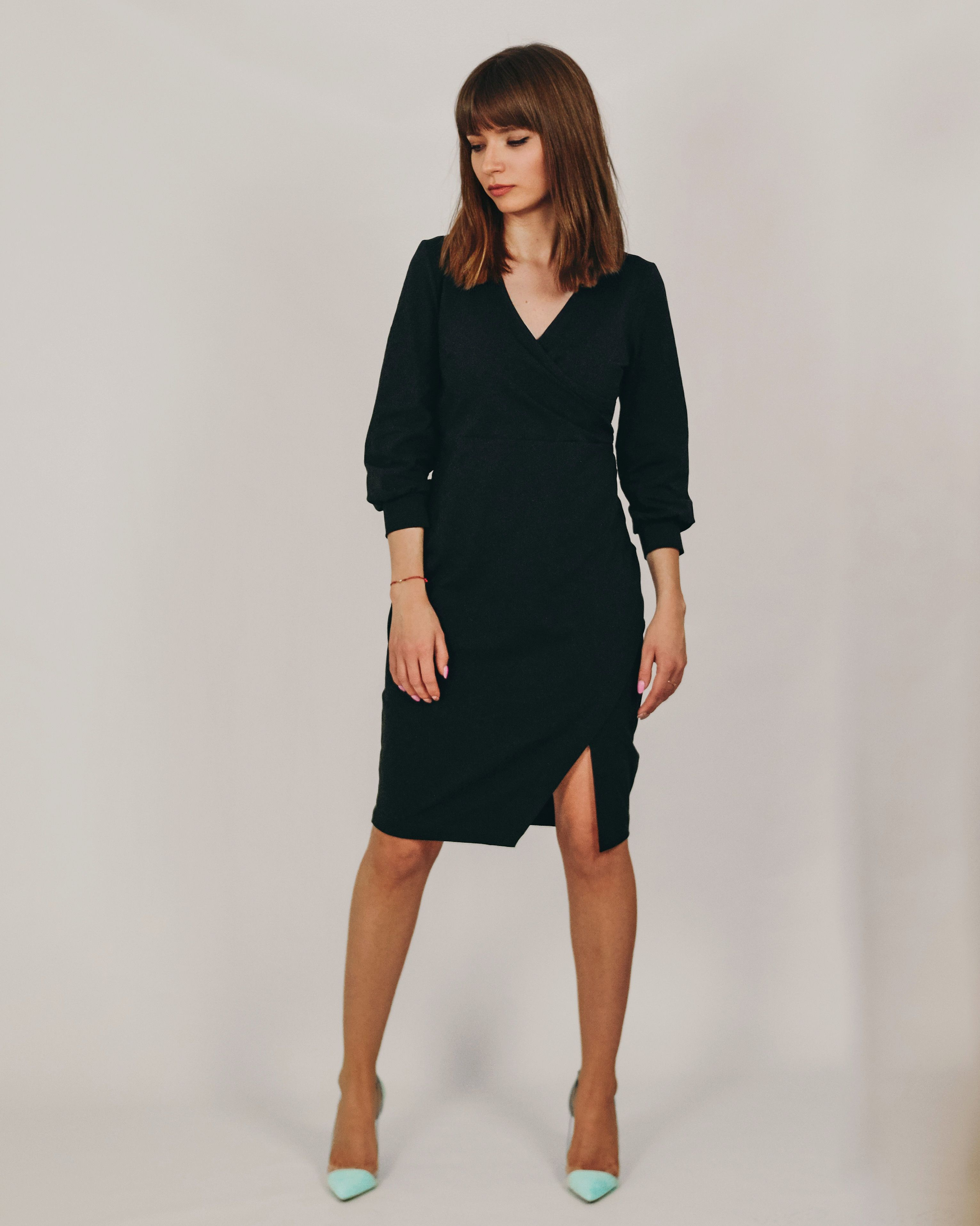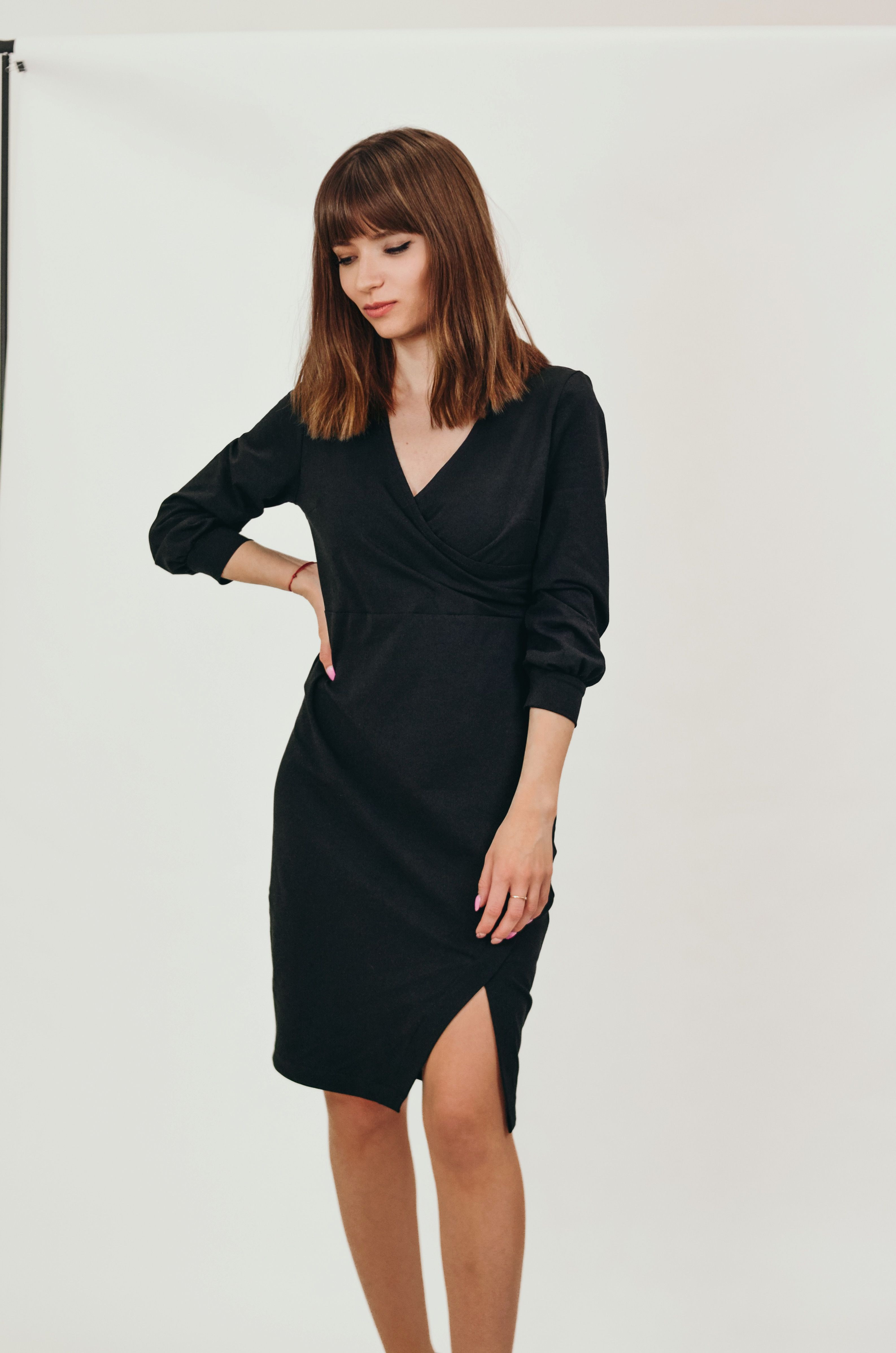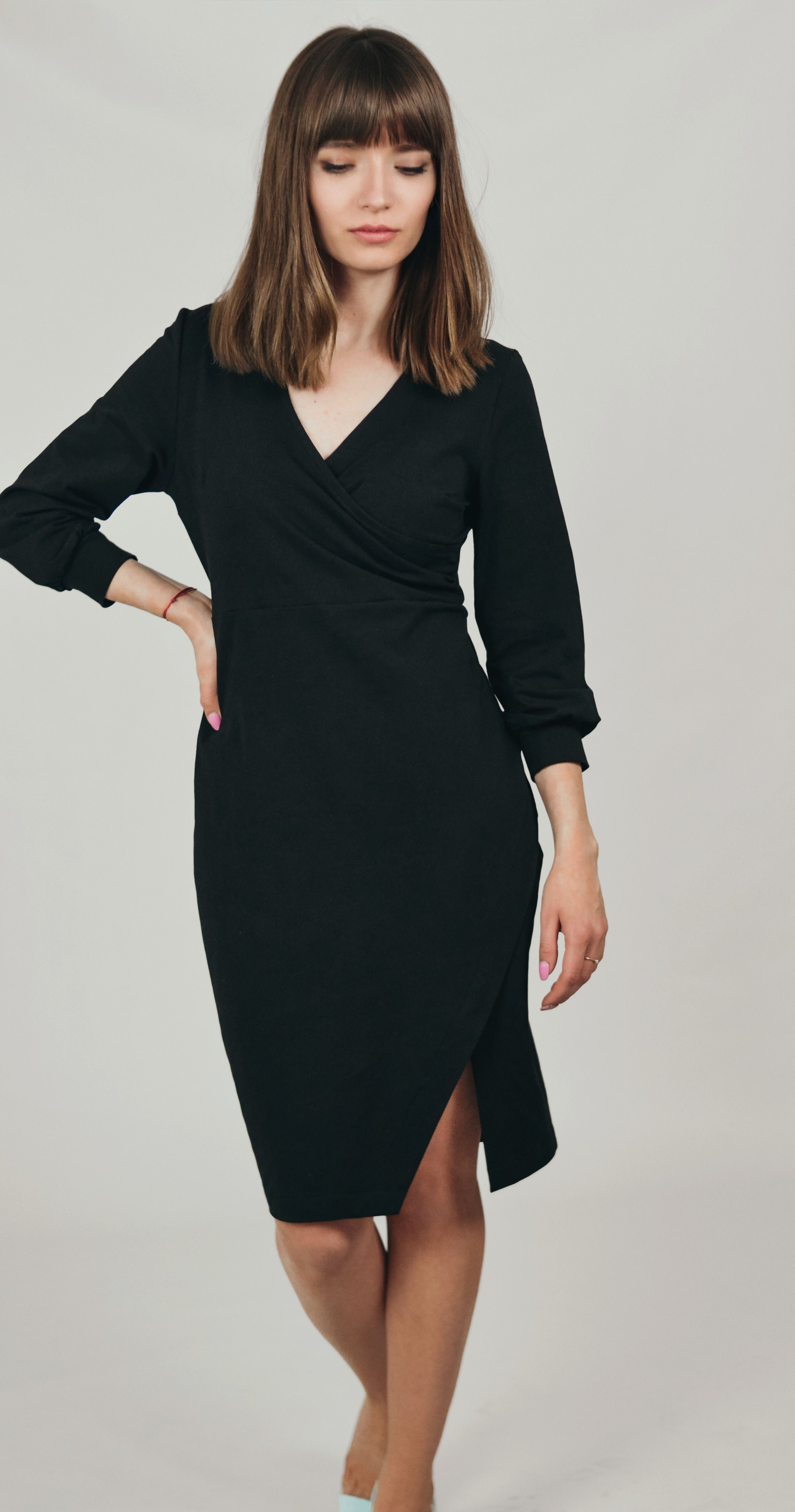 Krój ołówkowy z rozcięciem z przodu. Cięcie zszyte - dół sukienki nie rozchodzi się w czasie chodzenia.